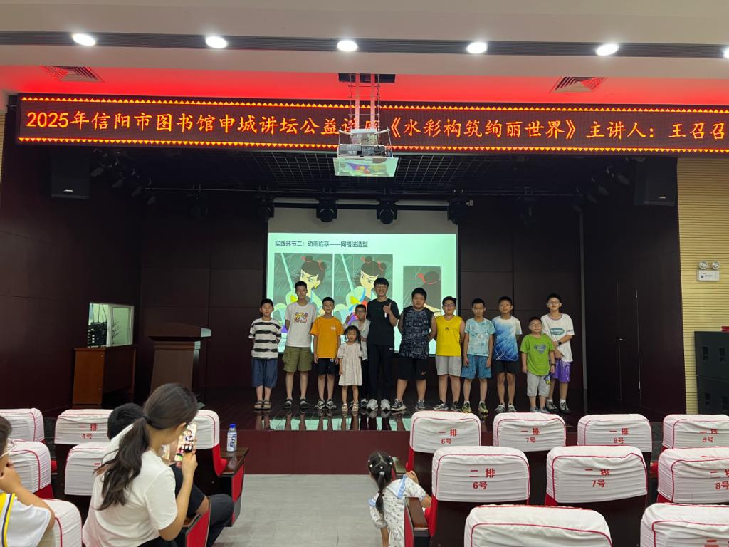 为深入学习贯彻习近平文化思想,落实文化和旅游部《“十四五”公共文化服务体系建设规划》关于“推动高校优质资源向社会开放共享”的要求,7月12日下午,信阳市图书馆在一楼报告厅举行了“色彩基础——水彩构筑绚丽世界”公益讲座在,我们青年教师王召召担任主讲,来自全市中小学的学生及家长现场参与。