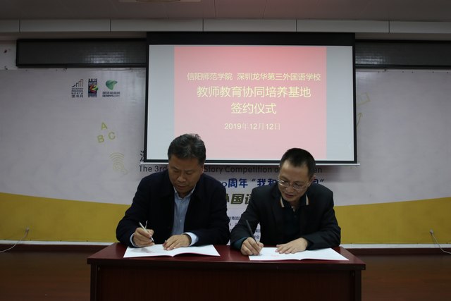 聂细刚对betway唯一官网付永昌一行表示热烈的欢迎,并介绍了学校的办学情况。深圳市龙华第三外国语学校是深圳市龙华区重点打造的高起点、高规格、高品质的优质特色学校。学校立足龙华区“积极教育”发展背景,提出“卓越教育”发展核心理念,力争形成积极向上、特色鲜明的外国语校园文化,建设一所植根中国、面向世界的外国语品牌学校,培养具有中国精神、世界情怀的国际公民,并努力让每一位师生志存高远,独立创新,不断超越自己。付永昌对深圳市龙华第三外国语学校的办学理念、教学特色、校园文化等给予高度评价,同时介绍了信阳师范学院及betway唯一官网的办学情况。最后,付永昌与聂细刚共同签署教师教育协同培养基地协议书。仪式后,与会人员对学校教学以及校园建设情况进行了现场考察,围绕师范生协同培养工作,进行了深入交流探讨。